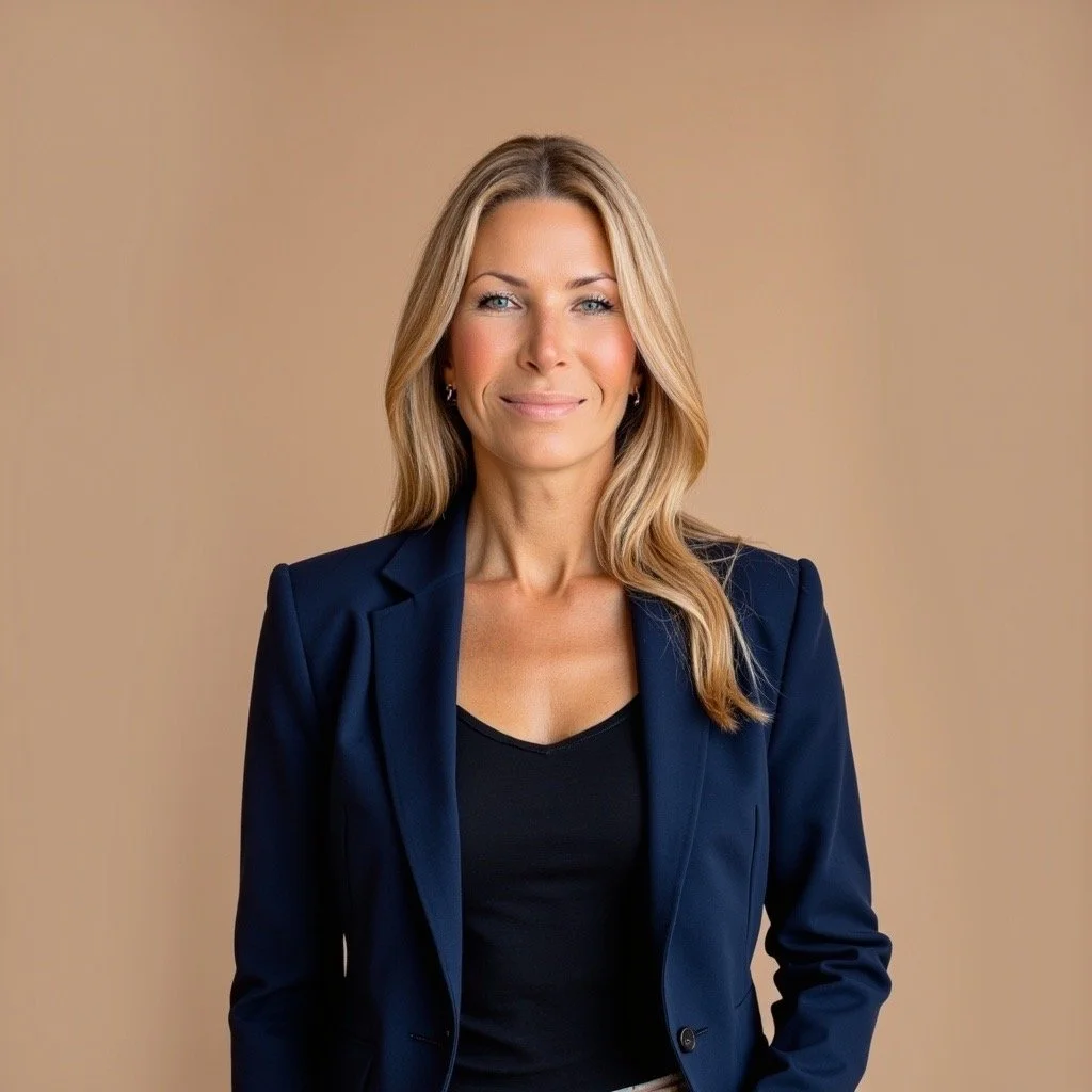 A woman with blonde hair wearing a black shirt and navy blazer standing against a beige background.